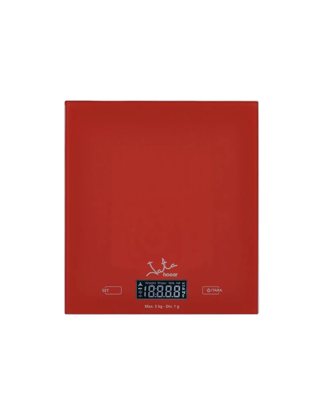 Diseño moderno y precisión profesional. Con capacidad para 5 kg y alta sensibilidad electrónica, esta báscula roja de JATA mide peso y volumen con exactitud de 1 g/1 ml.