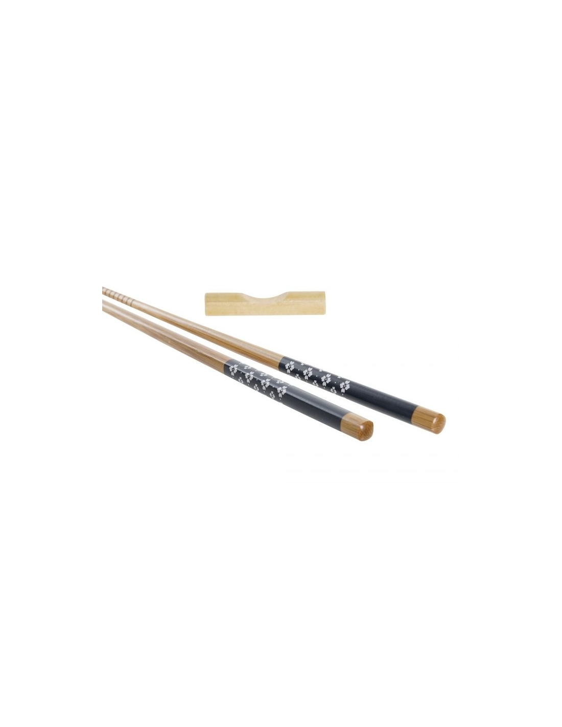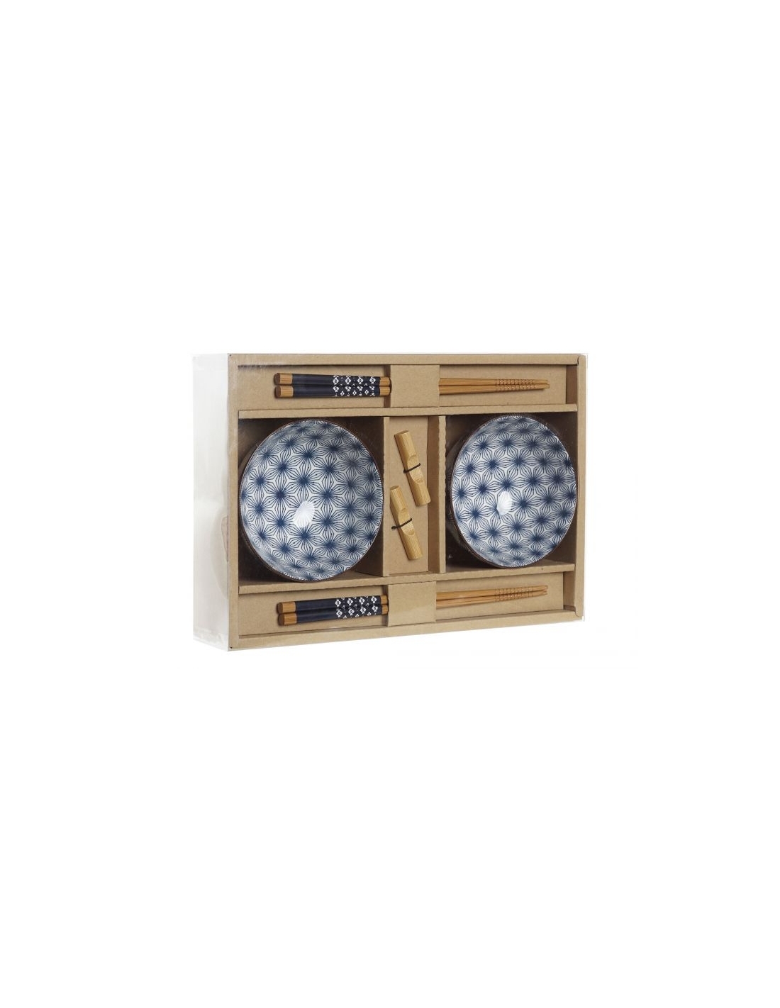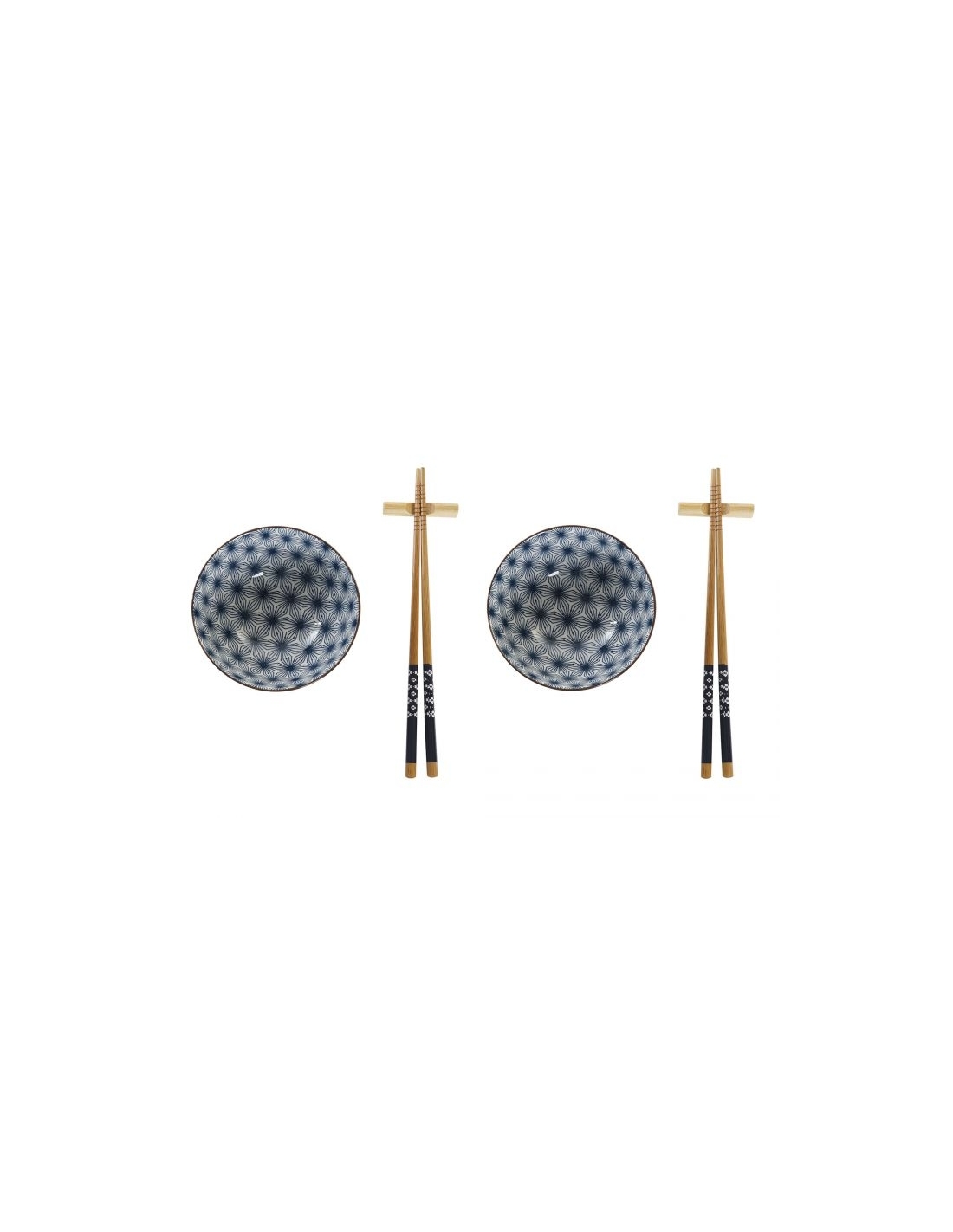 Los boles están fabricados en porcelana y los palillos y las piezas para apoyarlos están fabricados en bambú.
