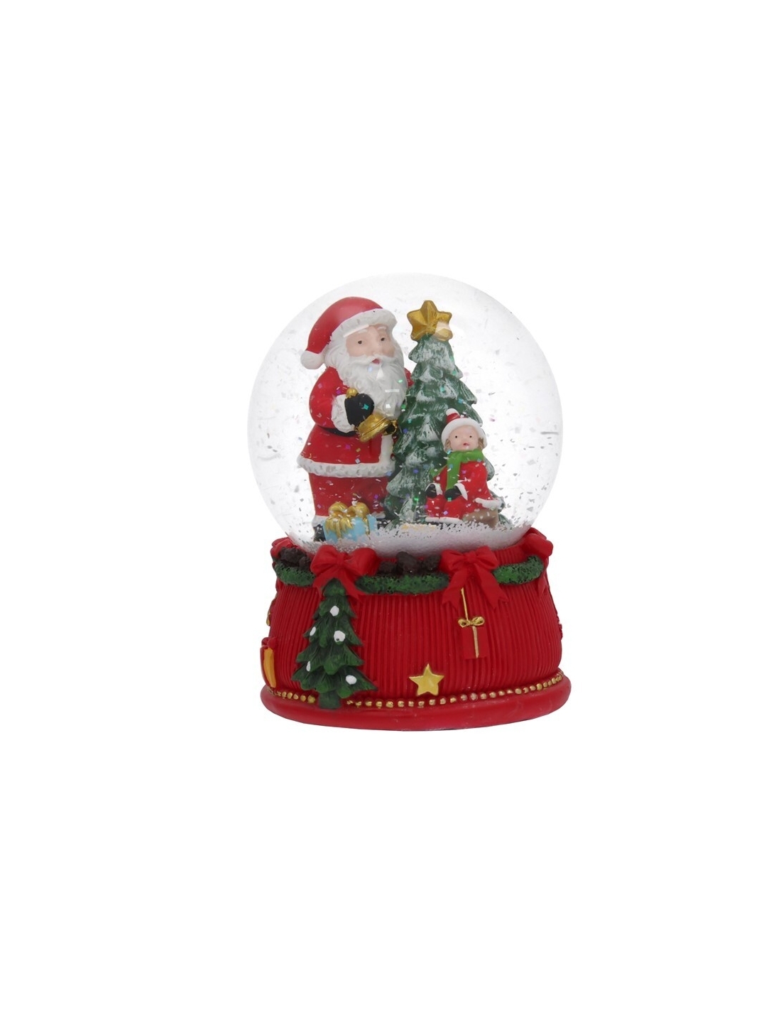 Esfera de vidrio de 14 cm de altura y 10 cm de diámetro con base de resina roja decorada con Papá Noel.