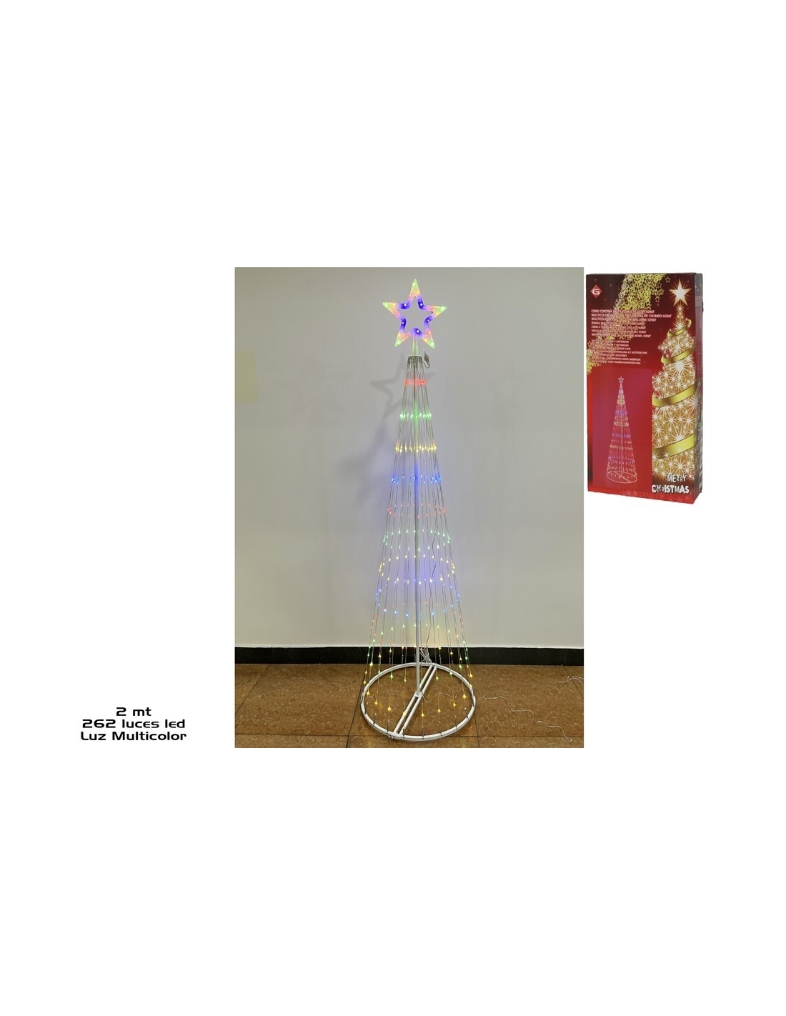 Decoración navideña en forma de cono cortina rematada con una estrella y equipada con 262 luces LED multicolor. Ideal para iluminar y ambientar espacios exteriores e interiores durante la temporada festiva.