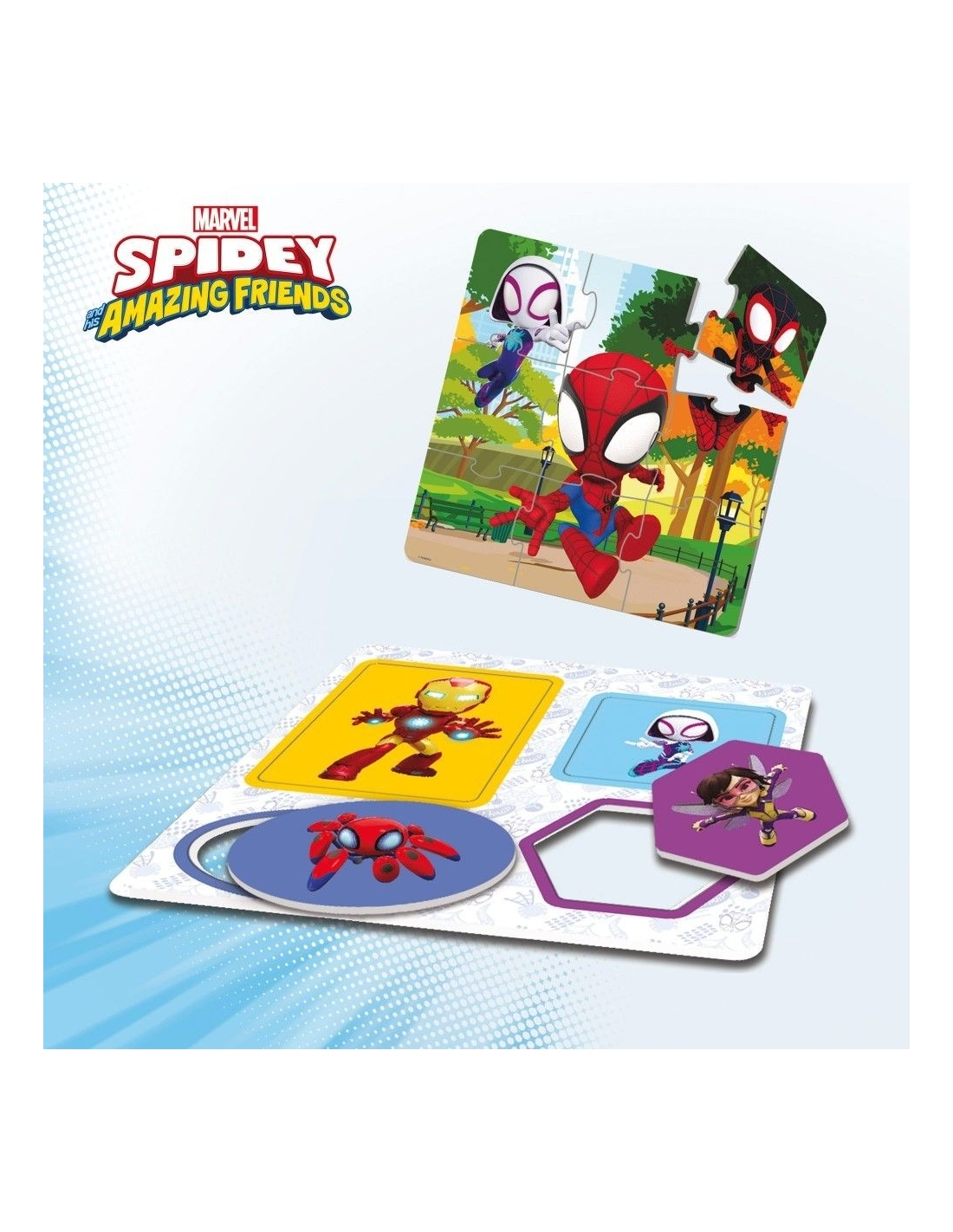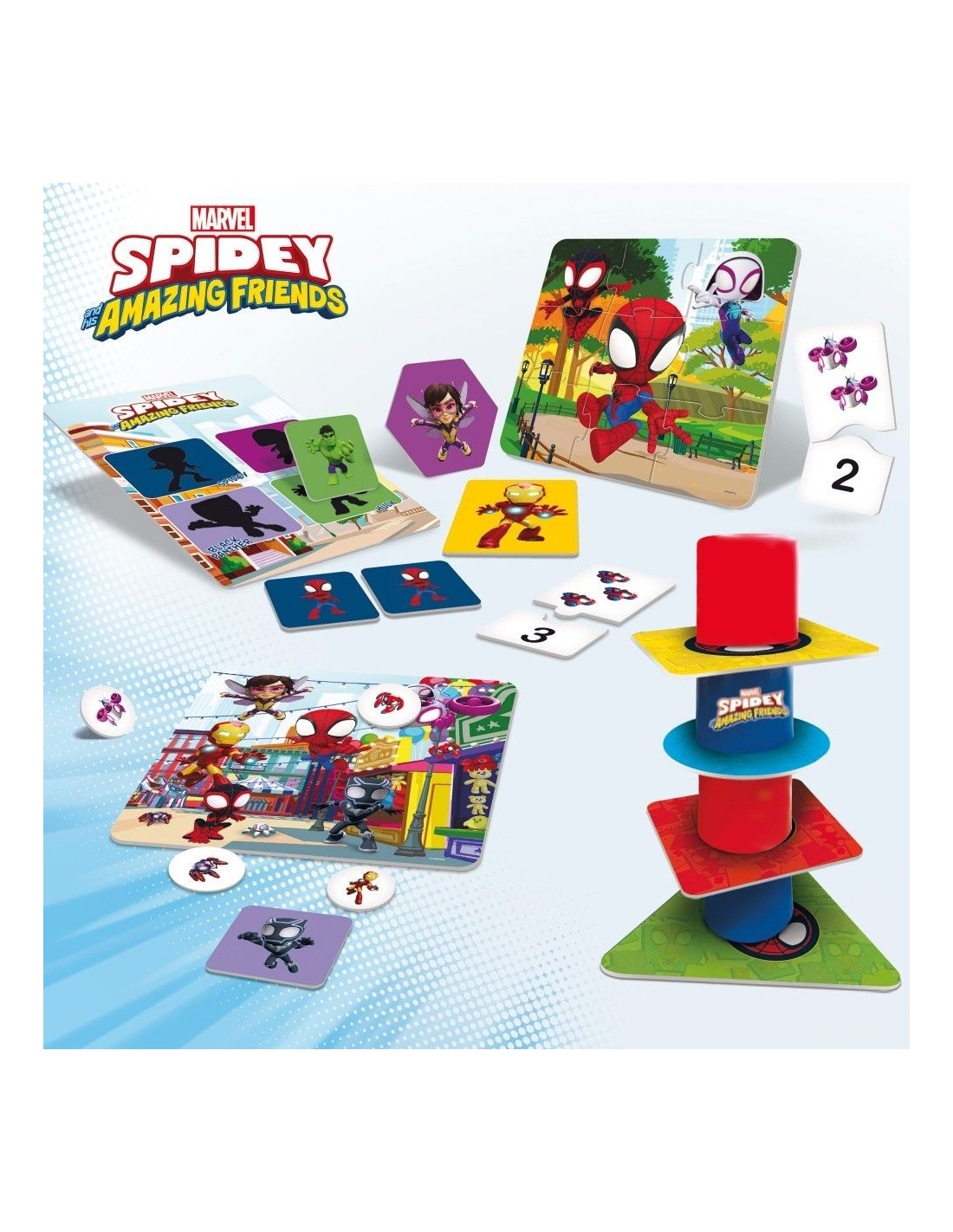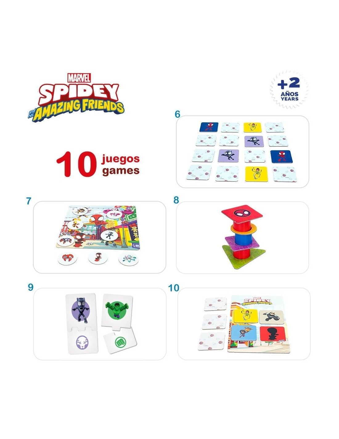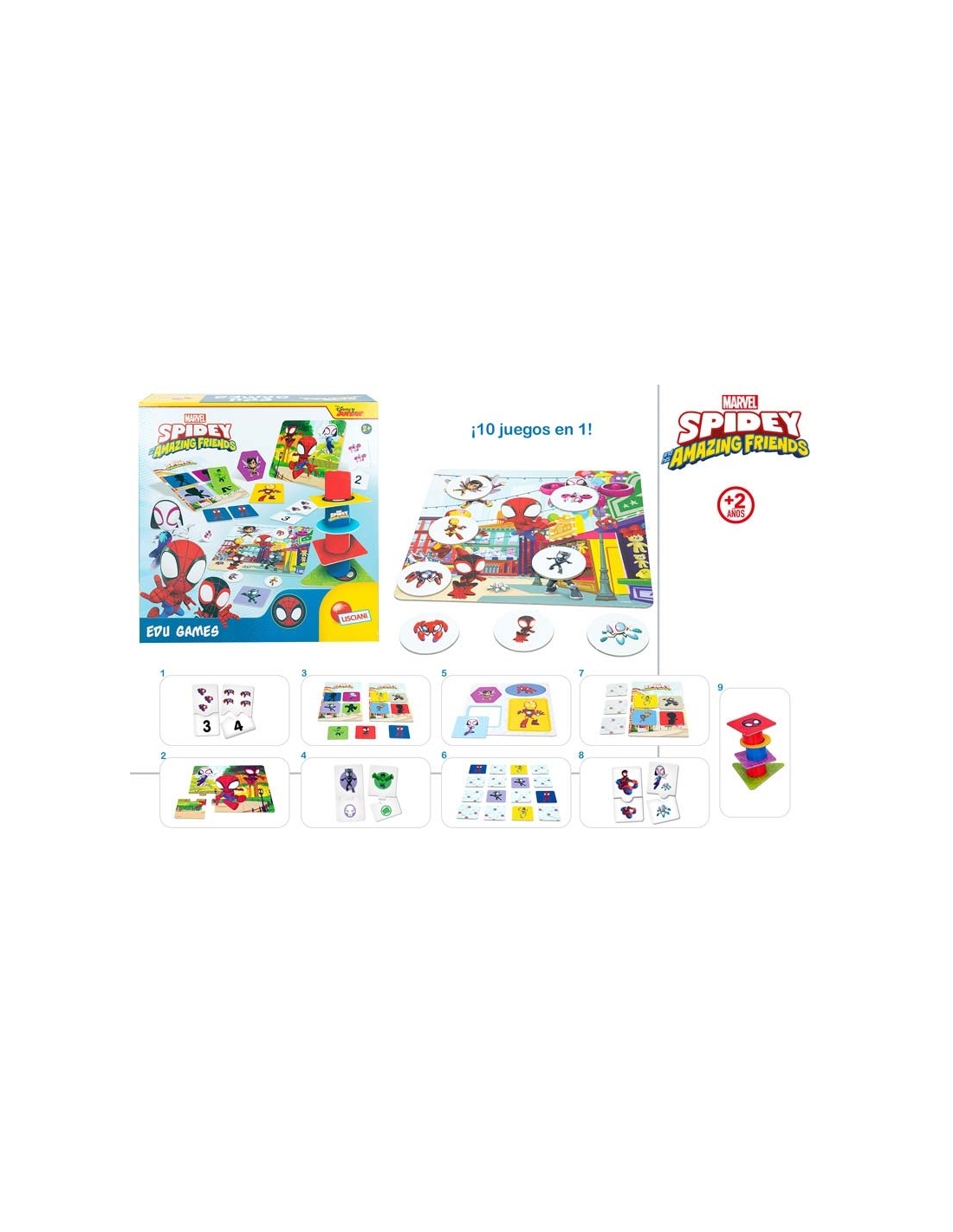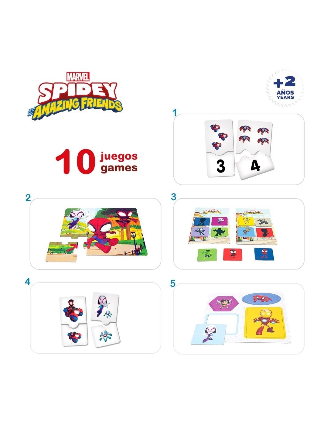 Increíble colección de 10 juegos educativos especialmente diseñados para los más pequeños, inspirados en el maravilloso mundo Spidey y su superequipo. Descubre una cuidadosa selección de actividades divertidas e instructivas que ayudarán a los niños a desarrollar competencias básicas, estimular su lógica, atención, memoria e imaginación: puzle, torre con formas, puzle geométrico, busca encuentra, primeros colores, primeros números, juego de asociaciones, memo, juego de las sombras y bingo.