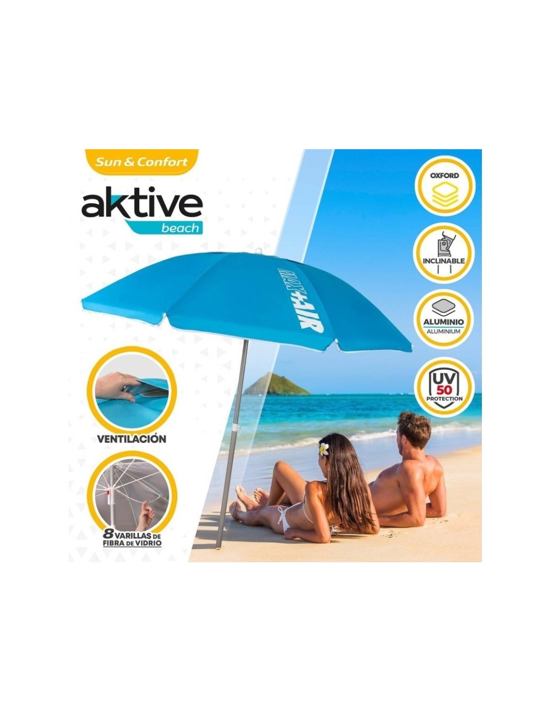 Sombrilla de Ø200 cm con estructura de aluminio de 28/32 mm. Confeccionada en poliéster con protección UV50, incorpora 8 varillas de fibra de vidrio, sistema inclinable y revestimiento plateado para mayor protección solar.